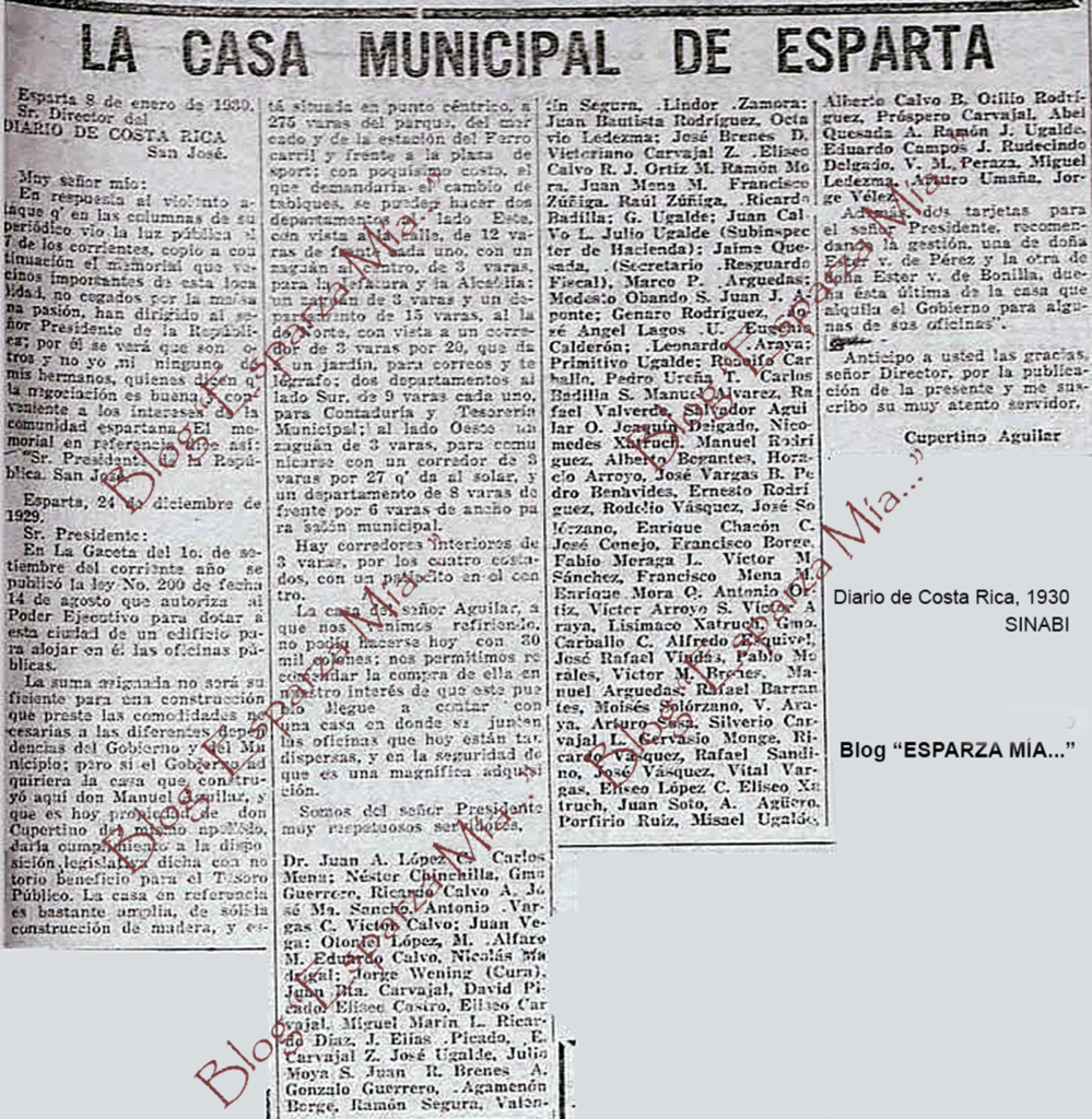 Apreciados(as) Amigos(as): Hoy, les presentamos un par de documentos del año 1930, relacionados con una polémica de dos bandos políticos de la ESPARTA de esa época, unos abogando por la compra de un terreno y la correspondiente construcción de un edificio municipal, y otros defendiendo su tesis de comprar una casa, propiedad de don Cupertino Aguilar, con el fin de unificar las dispersas oficinas municipales, según acotaron. Dicha casa se ubicaba donde actualmente se encuentra el Jardín de Niños de Esparza.